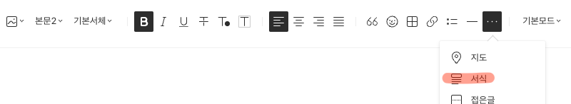 3. 글 작성 시, 상단 더보기(⋯) > 서식에서 iframe 서식을 불러오면 <iframe> 태그가 삽입된다.