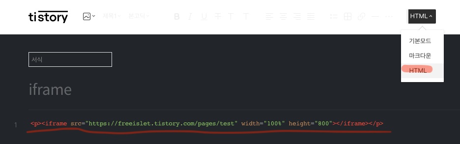 HTML 모드 대신 더보기(⋯) > HTML로 <iframe> 태그를 추가할 수도 있다. 하지만, 이렇게 하면 편집 중에 <iframe> 내용이 보이지 않는 단점이 있다. (상관 없다면 이 방법이 더 좋은 듯...)