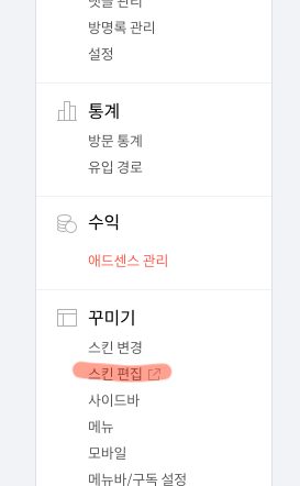 1. 관리 페이지 > (꾸미기 섹션) 스킨 편집 클릭