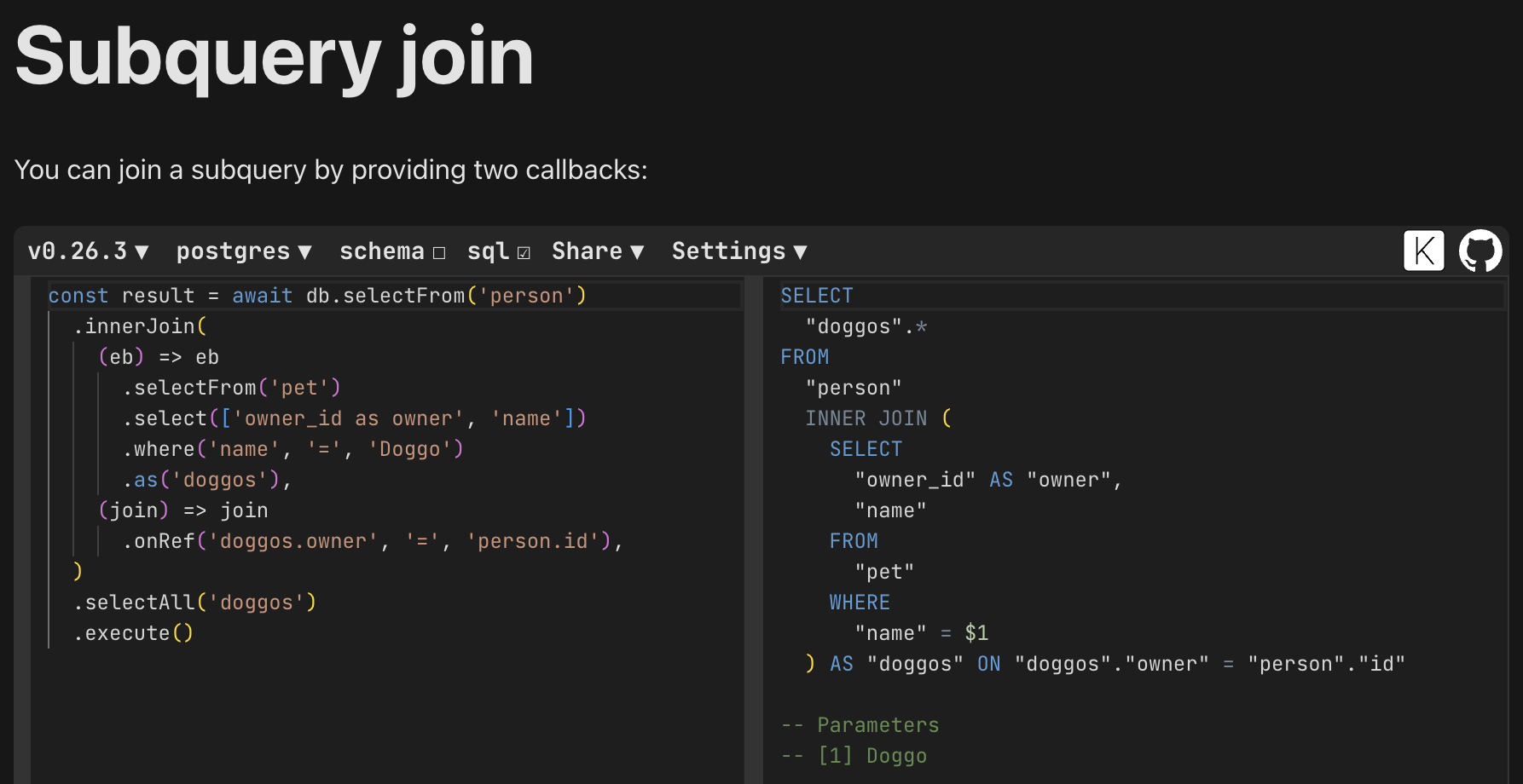 대신 Kysely는 쿼리 구문과 1:1 대응되게 코드를 짜면 돼서 훨씬 편할 것 같다. 예를 들어, Kysely에서 서브쿼리를 조인하는 예제는 다음과 같다.