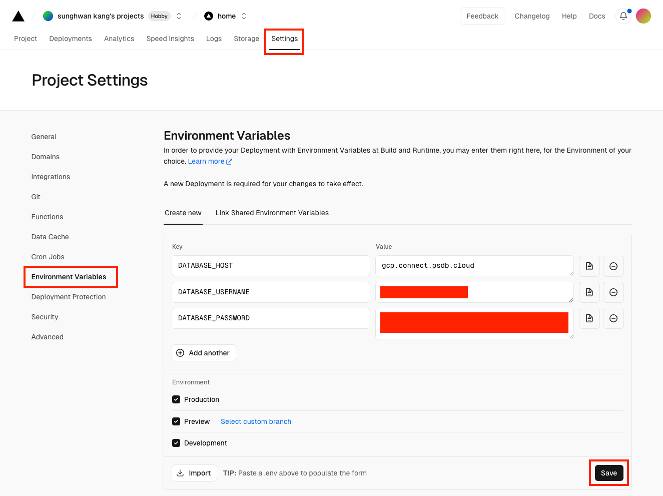 Settings > Environment Variables 페이지에서 아래와 같이 DATABASE_HOST, DATABASE_USERNAME, DATABASE_PASSWORD 환경 변수를 추가하고, 하단의 Save 버튼을 누르면 저장된다.