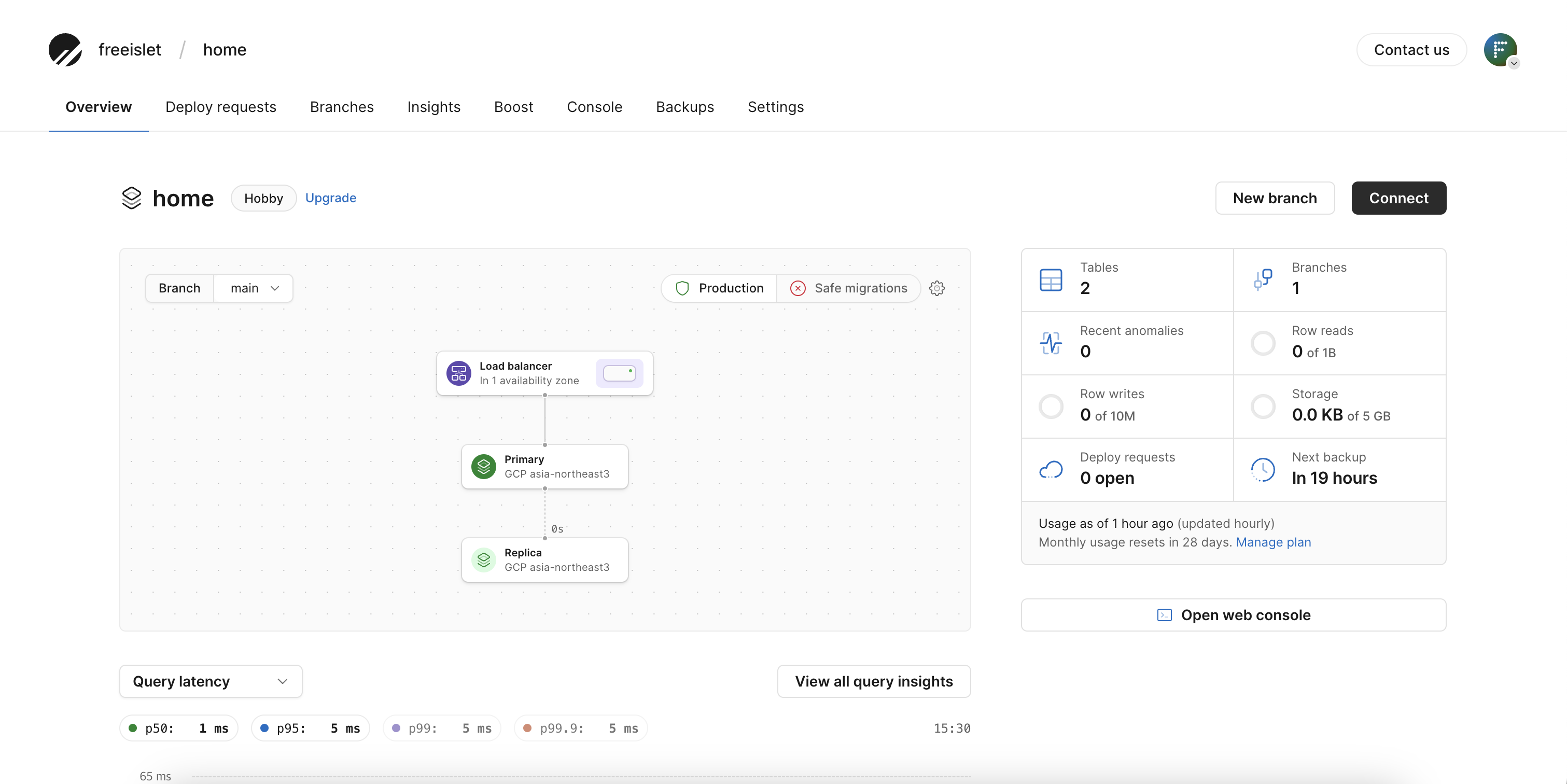 https://planetscale.com/docs/tutorials/planetscale-quick-start-guide를 따라하면 정말 쉽게 새 데이터베이스를 만들 수 있다. 데이터베이스 생성이 끝나면 대시보드에서 DB 상태를 비롯해 각종 정보를 볼 수 있다.