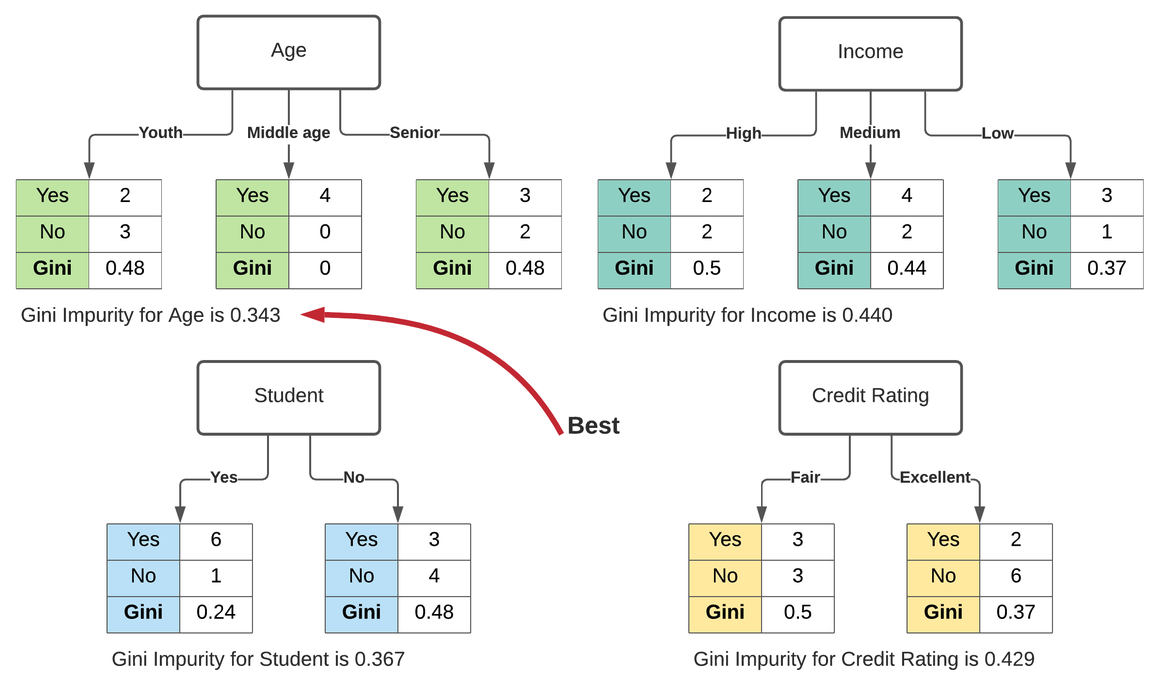 Age, Income, Student, Credit Rating 피쳐로 각각 분류했을 때 Age 피쳐의 Gini Impurity가 0.343으로 가장 작으므로, Decision Tree의 루트 노드는 Age 피쳐로 분류해야 한다.
